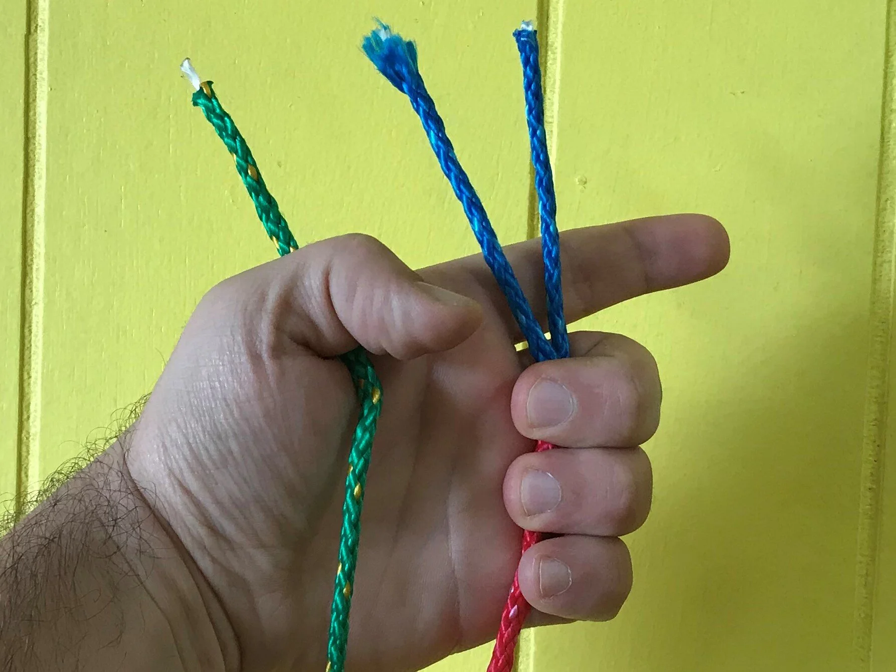 HOLD THE THREE ROPES IN YOUR HAND (SHORT MEDIUM, LONG). THE SHORT ONE TOWARD YOUR THUMB.